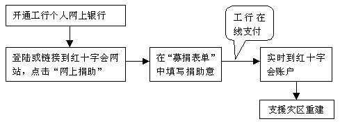 |   2004年12月26日,印度尼西亚苏门答腊岛附近海域发生百年罕见的大地震,引发的海啸横扫南亚、东南亚、甚至波及7000公里外的非洲国家。一时间,度假胜地变成人间地狱。房倒屋塌,尸横遍野,超过15万个鲜活的生命在新年即将到来的时候消逝了……   为救助深受地震、海啸影响的灾民,为帮助受灾国家人民尽快重建家园,为满足人们多渠道献爱心的需要,中国红十字会与中国工商银行再次携手合作,共同发起“点一次鼠标 献一份爱心”——为海啸灾区网上捐款活动。   据介绍,爱心人士只要开通中国工商银行“金融@家”个人网上银行,就可以不受时间地点的限制,通过工行网站(www.icbc.com.cn)链接或直接登录中国红十字会网站(www.redcross.org.cn),确定捐赠项目,在线填写捐赠表单,通过工行在线支付,就可时时完成资金捐献。网上捐款成功后,中国红十字会将把爱心人士的所有捐款全额捐献给受灾国家,工商银行免收中国红十字会和捐助者任何费用。此外,爱心人士还可以通过中国工商银行手机银行(短信)免费进行捐款,奉献爱心。   中国工商银行有关人士还表示,为倾力支持我国慈善事业的发展,今后爱心人士可以继续捐助中国红十字会项下的所有慈善项目,工行免收任何手续费,让更多的爱心人士了解网上捐助,使用网上捐助,实现自己献爱心的美好夙愿。       新闻链接: 一、网上捐款操作指南   爱心人士首先需要成为中国工商银行“金融@家”个人网上银行客户。新客户可以网上自助注册,也可以到任何一家工行网点柜面注册。   网上捐款操作流程:   1、登陆中国工商银行网站(www.icbc.com.cn)直接点击“网上捐款”图标或进入“网上商城”,选择“中国红十字会”,链接到中国红十字会网站,也可以直接登陆中国红十字会网站(http://www.redcross.org.cn),然后点击“网上捐助”菜单,在线填写捐赠表单,选择“工行在线支付”,系统将弹出网上支付页面。输入正确的注册卡号和支付密码后,所捐资金及时到达红十字会的账户中。(注:此项服务免收任何手续费。)   2、若爱心人士已在柜面开通工行金融@家个人网上银行汇款转账服务,也可以登录工行网上银行,进入“我的账户—行内汇款-有账号汇款”,在正确填写中国红十字会总会的户名、账号(0200001009014413252)后即可使用该行汇款功能进行捐款。(注:使用汇款功能按照国家有关规定需要缴纳汇款手续费,收费标准与柜面相同。)