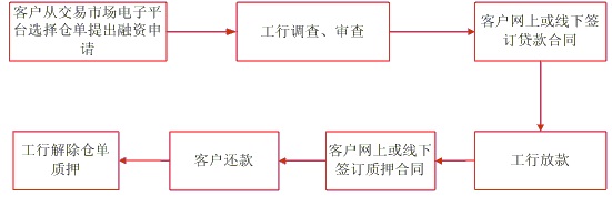 电子仓单买方融资是指买方交易商在网上交易市场与卖方形成电子订单,交纳保证金或预付款后,以通过网上商品交易市场购买商品所对应的电子仓单作质押而向工行申请的短期融资业务。